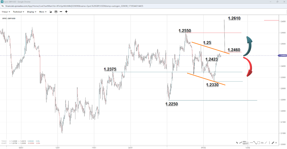 Cable price action shows a potential rising flag pattern pending a higher breakout around 1.2460, which may open the door to a measured-move projection of 1.2610. The bullish continuation pattern suggests short-term resistance levels at 1.25 and a peak of 1.2250. On the downside, failure to reclaim the upper flag trendline could lead to an initial rejection or a full-blown reversal. Supports lie at 1.2423, 1.2375, and the swing low of 1.2330, followed by 1.2250 in the longer term.