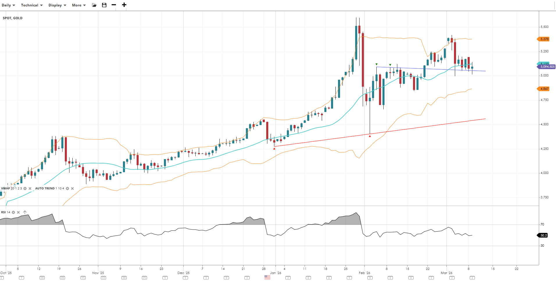 Gold remains in a broader bullish trend but has entered a range-bound phase, consolidating near the VWAP following its sharp early-year rally. Momentum has cooled to neutral with RSI near the midpoint, as the metal digests gains and awaits a fresh catalyst to determine the next directional move.