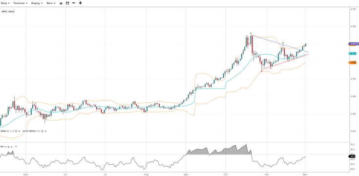 Gold is rallying again after breaking out of a triangle pattern but is still in a correction phase below former highs within its bullish trend, trading at 4,256 above VWAP of 4,117. RSI at 66.3 signals continued strength. Support lies at 3,986 with resistance at 4,256.