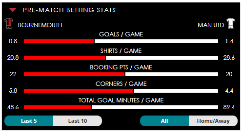 To see all the Bournemouth v Man Utd betting stats and form, visit our pricing page to view our Pre-Match betting stats table or hover over/tap the chart image to see previous outcomes for that particular market.